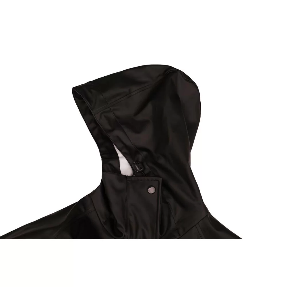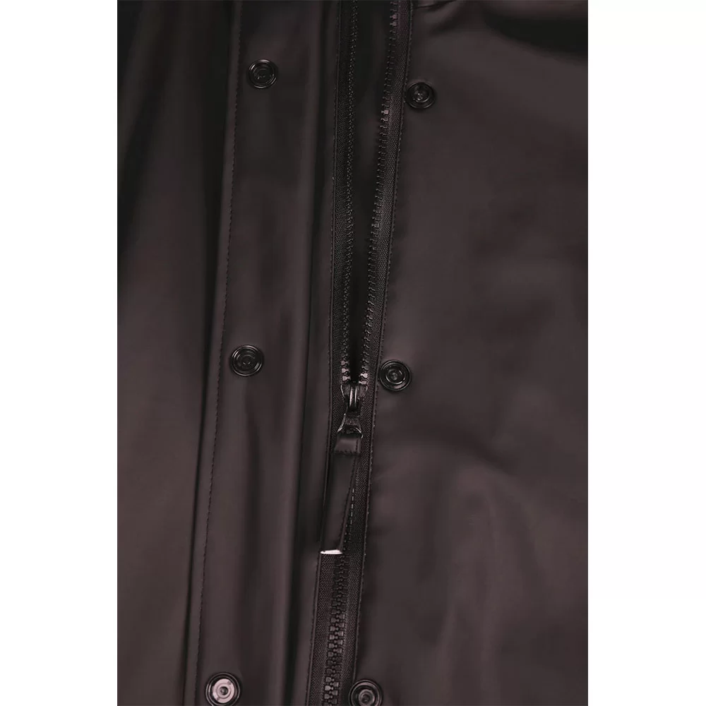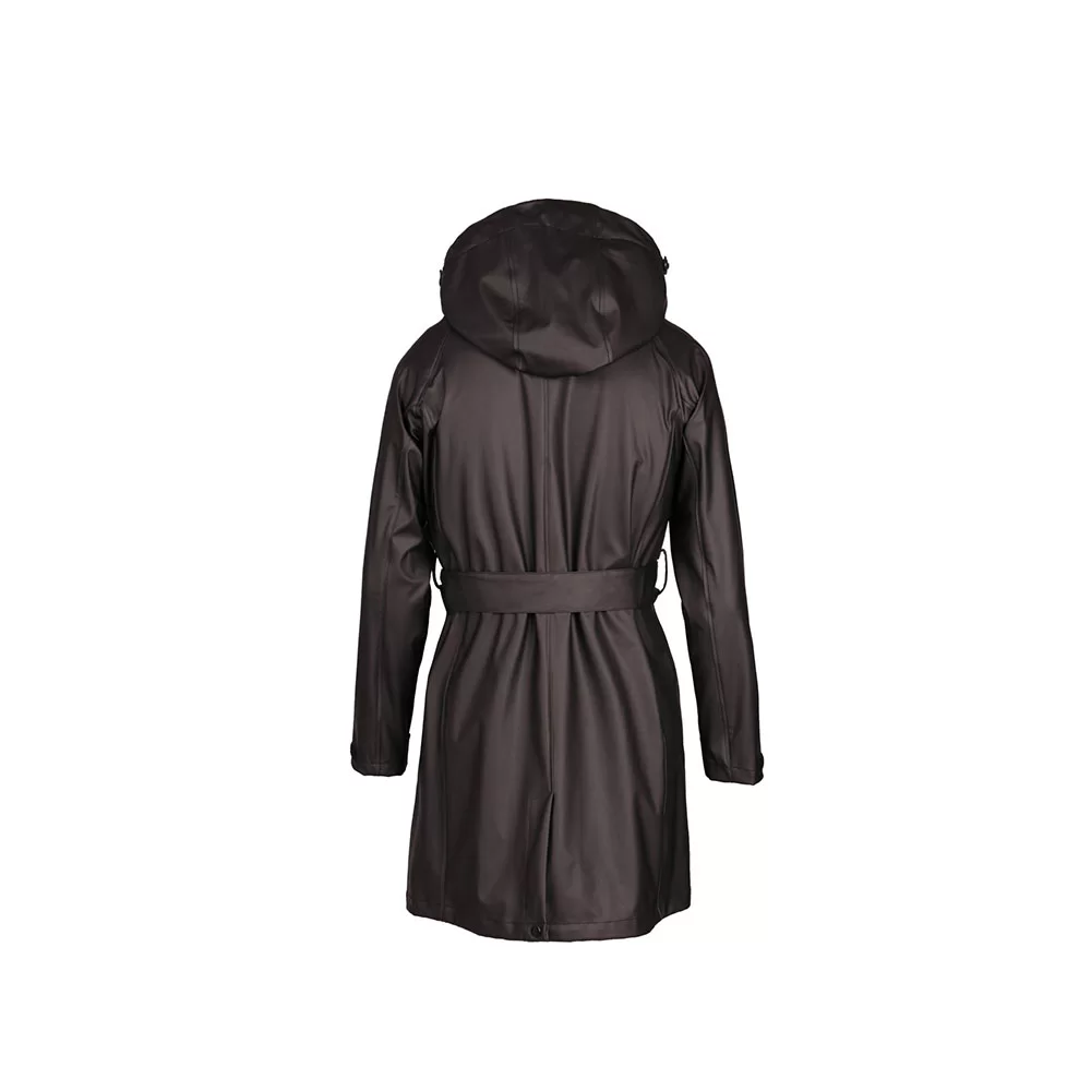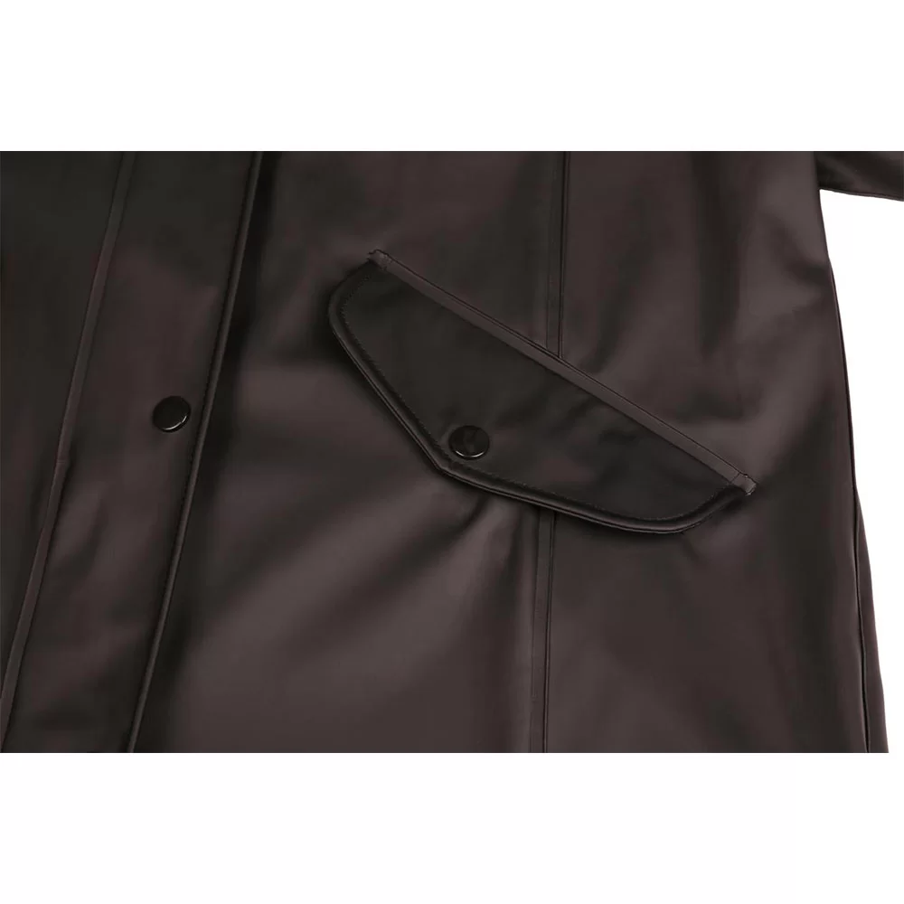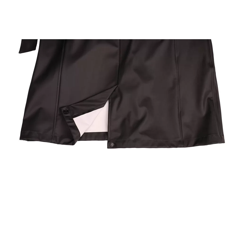 Ajaton sadetakki elegantilla, minimalistisella siluetilla, joka on valmistettu PU-materiaalista. Ominaisuuksiin kuuluu kaksisuuntainen vetoketju edessä nappeilla, vyö säätää vyötärön muotoa ja mukavuutta sekä tuuletusaukko takana lisää liikkuvuutta. Säädettävä huppu ja korkea kaulus tarjoavat tyylikkään ja kestävän suojan sadepäivinä.